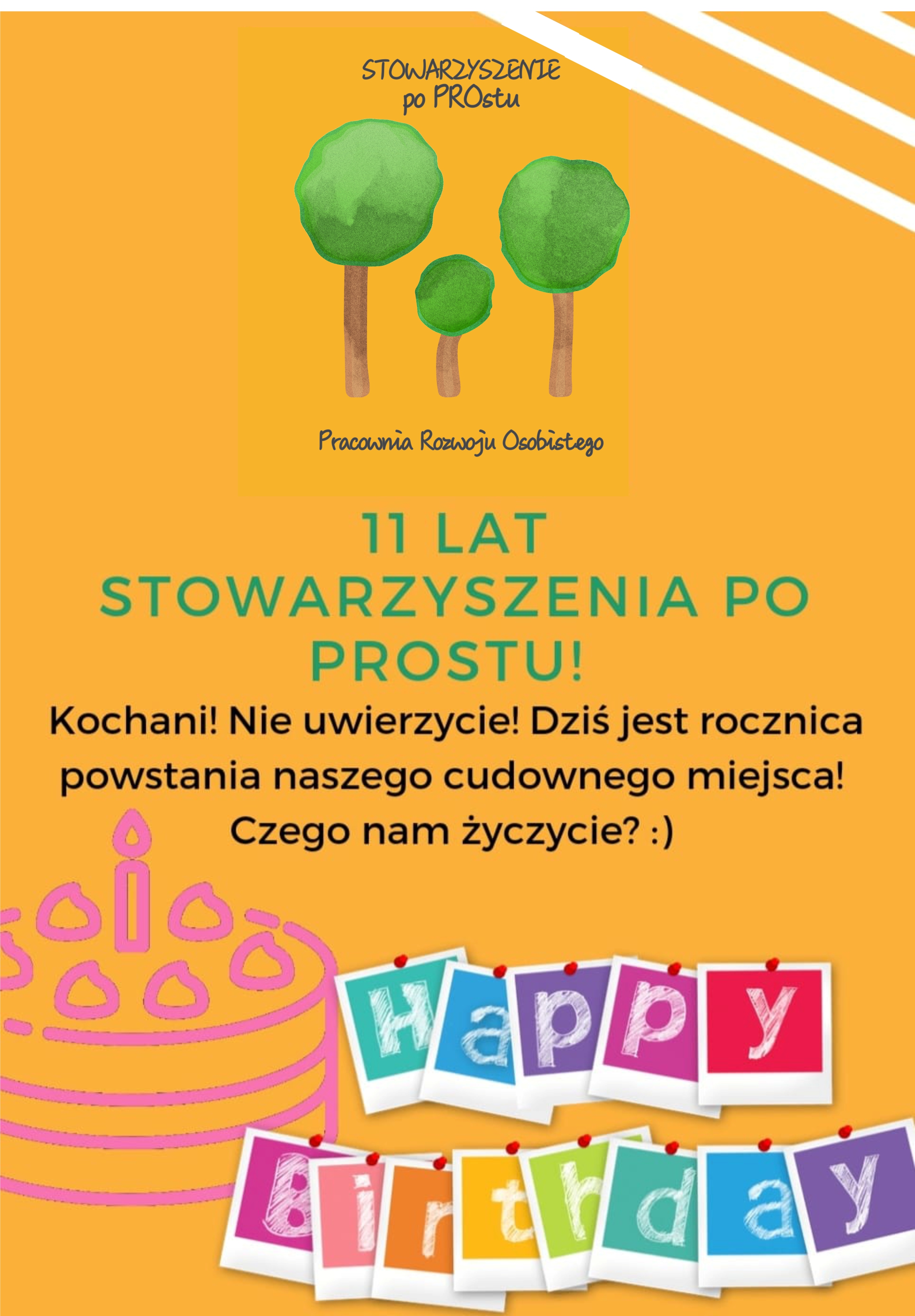Tego dnia 11 lat temu odbyło się pierwsze walne zgromadzenie członków Stowarzyszenia po PROstu. Dziękujemy, że z nami wytrzymaliście. Oj, przez te wszystkie lata tyyyle się wydarzyło! Nastąpiło wiele zmian, ale zgodnie stwierdzamy, że gdyby nie one, nie byłoby nas w miejscu, w którym jesteśmy dziś. Mamy nadzieję, że każdy, kto do nas trafia jest chociaż "TROCHĘ" zadowolony z naszej pracy. Pod swoimi skrzydłami mamy około 200 dzieci i dorosłych na stałych terapiach oraz różnych warsztatach.